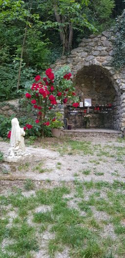 Za pierwszym zakrętem pojawia się replika Groty Lourdes (Münichsthaler Lourdesgrotte), katolickiego miejsca pielgrzymkowego, przed którą znajdują się liczne ławeczki. Po lewej stronie groty znajduje się dzwonek, aby kapłan mógł nim głośno bić wzywając wiernych na msze. Po prawej stronie droga krzyżowa prowadząca w górę do lasu wykonana przez najmłodszych mieszkańców naszej wsi.